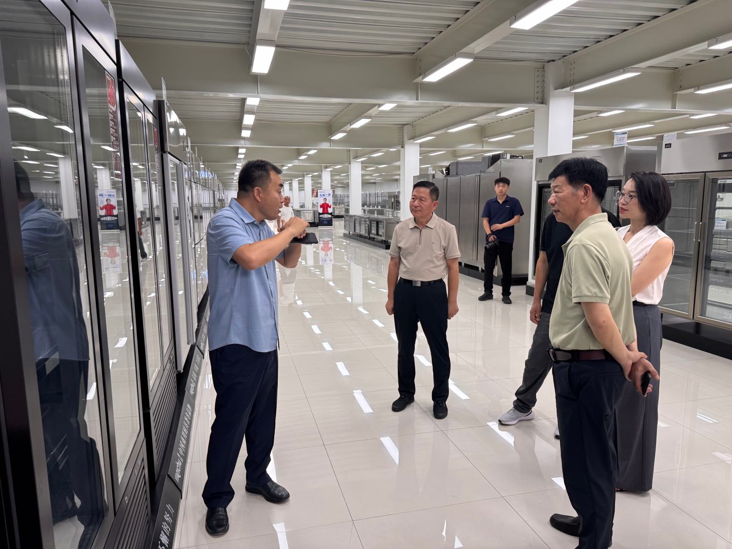 在滨州市美厨厨业有限公司,董事长郝绪光陪同重点考察了智能化生产线与市场拓展策略,共同探讨厨电产业升级路径。